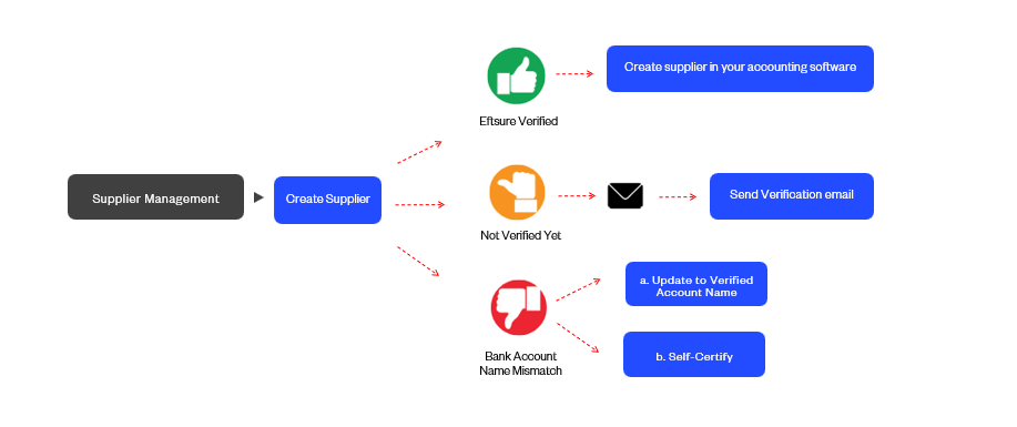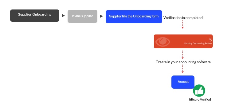 Option 2: Send an Onboarding form. Once the Supplier has completed the form, Eftsure verifies the details and then notifies the customer that the onboarding is ready for review. Users update their ERP system and accept the changes in Eftsure.