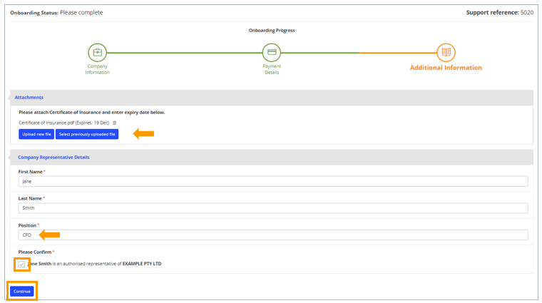 The supplier completes the Additional Information section. These are specific additional information that you may request on your onboarding form. This may include documentation requirements, acceptance of your Terms & Conditions, invoices, and other relevant details.
