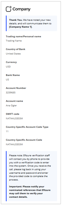 - The supplier enters the bank account details.